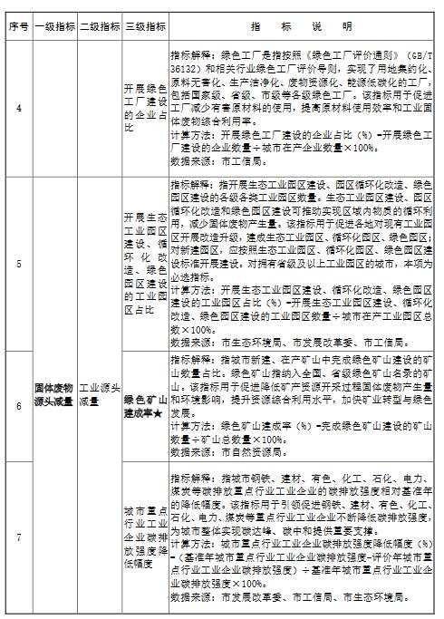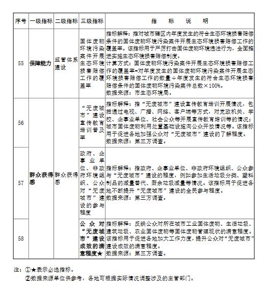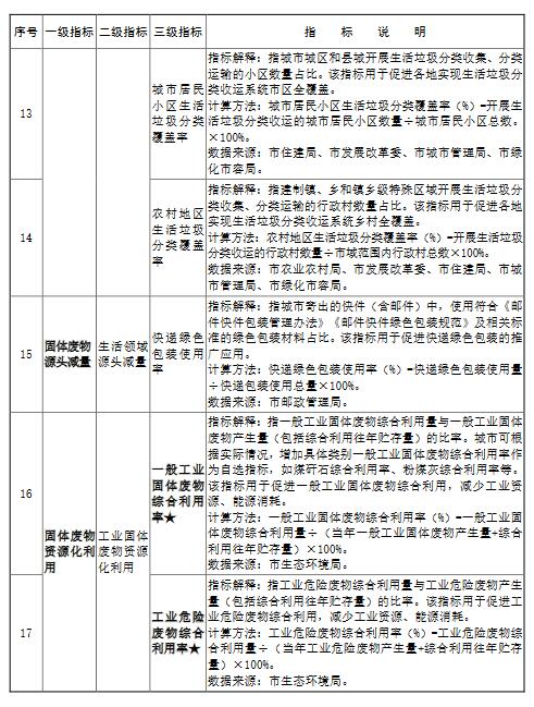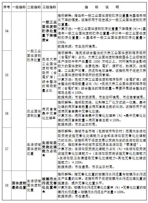 一級(jí)指標(biāo)主要包括固體廢物源頭減量、資源化利用、最終處置、保障能力、群眾獲得感等 5 個(gè)方面。二級(jí)指標(biāo)主要覆蓋工業(yè)、農(nóng)業(yè)、建筑業(yè)、生活領(lǐng)域固體廢物的減量化、資源化、無(wú)害化,以及制度、技術(shù)、市場(chǎng)、監(jiān)管體系建設(shè)與群眾獲得感等 17 個(gè)方面。三級(jí)指標(biāo)是對(duì)一級(jí)指標(biāo)和二級(jí)指標(biāo)的具體細(xì)化和量化,劃分為兩類:第 I 類為必選指標(biāo)(標(biāo)注★),共 25 項(xiàng),是各地開展“無(wú)廢城市”建設(shè)均需落實(shí)的約束性指標(biāo)。第 II 類為可選指標(biāo),共 33 項(xiàng),是各地依據(jù)城市類型、特點(diǎn)及任務(wù)安排進(jìn)行選擇的指標(biāo)。各項(xiàng)指標(biāo)數(shù)據(jù)主要來(lái)源于現(xiàn)有統(tǒng)計(jì)調(diào)查數(shù)據(jù)和專項(xiàng)調(diào)查數(shù)據(jù)。此外,各地可結(jié)合自身發(fā)展定位、發(fā)展階段、資源稟賦、產(chǎn)業(yè)結(jié)構(gòu)、經(jīng)濟(jì)技術(shù)基礎(chǔ)等差異性,聚焦減污降碳協(xié)同增效,自行設(shè)置自選指標(biāo)。
